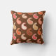Throw pillow in a minimalist, modern paisley pattern, outlined accented with dots - earth colours of terracotta, rust, chocolate, and mustard, on a deep cocoa / chocolate brown background