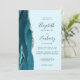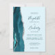 The left-hand edge of this elegant modern wedding invitation features a teal watercolor agate border trimmed with faux silver glitter. The customisable text combines handwriting, copperplate and italic fonts in dark teal on a pale teal background. The reverse side features a matching teal and silver agate design.