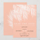 Modern simple white tropical palm tree with simple typography, a trendy and tropical wedding save the date theme with faux silver glitter tropical on palm tree leaf on peach salmon.