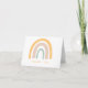 A modern kids thank you note featuring a modern pastel rainbow in mustard yellow, pink, and teal green. "Thank You" is underneath in mustard yellow sans serif font.