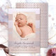 Baby girl photo announcement featuring your own favourite photo, framed by soft pastel peach and pink stripes, with a touch of grey and subtle gloss.