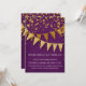 Sleek. Modern. Chic. Understated glam - with glittering pennant banners in two shades of golden glitter with sparkling twinkling falling confetti in various sizes and shade of gold. Sparkly starburst shining stars highlight the sparkle. A very contemporary typography text layout that is anything but traditional. It is simple and short. It says to your guests, "We're throwing a party and it will be the party of a lifetime!" For the elegant but non-traditional bride and groom. COLORS: deep dark violet purple and gold, golden glitters. Especially suited for fall or winter weddings, New Year's Eve Parties, Birthday parties and Anniversary party announcements.