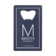 This bottle opener features personalised groomsman's monogram and name with title and wedding date in white modern sans serif font style on navy blue background.