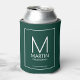 This can cooler features personalised groomsman's monogram and name with title and wedding date in white modern sans serif font style on emerald green background.
