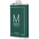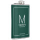 This flask features personalised groomsman's monogram and name with title and wedding date in white modern sans serif font style on emerald green background.