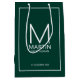 This gift bag features personalised groomsman's monogram and name with title and wedding date in white modern sans serif font style on emerald green background.
