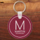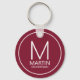 This keychain features personalised groomsman's monogram and name with title in white modern sans serif font style on burgundy red background.