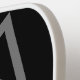 A pickleball-paddle personalised with his name and surname in different colours (sans serif font), over a grey background with a big oversized black initial letter... a modern monogram design, with the name of the stylish player.