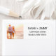 Add a personalised touch to your wedding save the date mailings with these custom couple's photo return address labels. The design features a square photo on the left for you to customise and your name and address on the right in a modern minimalist typography on white. Designed by artist ©Susan Coffey.