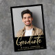 Modern black graduation announcement featuring the grad's photo and "Graduate" in a contemporary bold light gold script. Add their name, class year and school in simple light gold typography.
