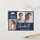 Modern dark blue graduation announcement postcard featuring 3 photos and "Graduate" in a contemporary bold white script. Add the grad's name, class year and high school or college in simple white typography.