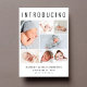 An elegant birth announcement to introduce your newborn baby to friends and family featuring "Introducing" across the top in large lettering, a 7 photo collage and their name, birth date and birth stats in simple modern typography. On the back, add another photo and your personalised message.