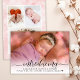 Modern, Girly Baby Birth Announcement 3 Photo Collage Cards. Elegant, cute 2-sided photo birth announcement template card featuring one (1) of your favourite baby (full) photo on front, with a pretty black hand lettered typography text overlay „introducing”, on white gradient. Easy to personalise it with your baby's name and birth stats. At the backing three (3) photos on blush pink watercolor look background.