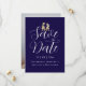 modern elegant photo wedding save the date with Whimsical Dinosaur theme wedding “Save the Date” navy blue and white Card Funny T-Rex Bride & Groom Wedding Announcement