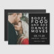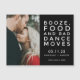 Stylish modern save the date magnetic cards are for the fun-loving couple who can't wait to celebrate with their family and friends. Black and white typography design with your photo that reads: Booze, food and bad dance moves. Customise with your photo, names and wedding date.