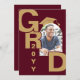 Modern Maroon Gold Photo Graduation Invitation. Celebrate your grad with these modern burgundy and gold graduation invitations featuring the graduate's photo on the front inside an arch shape instead of the letter A in Grad, and big bold letter spelling GRAD with graduation year on the front. On the back is the information for the graduation party including an image of a diploma and graduation party details for all your invited guests.