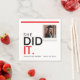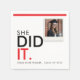 Honor her graduation with a bang using these eye-catching "She Did It" paper napkins. The impactful design features bold lettering in classic black and energetic red, announcing her triumph. A prominent photo frame area allows you to showcase a favorite picture of the graduate, making each napkin a keepsake. A sharp red stripe provides a pop of color, enhancing the overall festive feel. These napkins are designed to impress guests and celebrate the graduate's journey and future success.