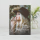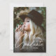 This trendy, elegant graduation party invitation features a photo of the graduate, with trendy modern white script along with the grad's name, school, and graduating class year. Rustic Boho style portrait. The back of the invitation contains all party information and location. Replace the sample photo with your own grad photo. Simply replace this sample photo with your own formal or casual photo that shows your own personality.