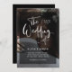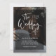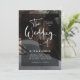 These modern, elegant wedding invitations feature your own personal photo covering the background completely. A sheer black overlay contains white trendy script typography. The back of the card is black, and features room for your wedding reception details, plus information so guests can visit your wedding website to RSVP online, including a scannable QR code.