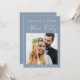 Modern dusty blue elopement or private wedding announcement and reception or celebration party invitation that features your photo, "Happily Ever After Party" in a mix of simple white typography and a chic white script. On the back, personalise your announcement and invitation, input the URL address of your wedding website to create a QR code for guests to scan for all the details and to RSVP online, and add your names in a signature-like script.