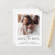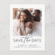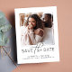 Simple save the date announcement postcard that features your photo with a square frame cut out and minimal modern typography with a touch of an elegant script. Personalise with your first names, wedding date and location. On the reverse, customise your save the date details and add your names in a signature-like script.