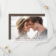 This design features a modern minimalist minimal simple photo, a QR code online website URL, a stylish trendy engaged couple picture, a wedding save the date invitations, an engagement one 1 single photo, a scan QR code web address, a contemporary basic plain simplistic, a modern wedding save the date, a creative unique modern typography, a white text overlay design style