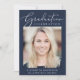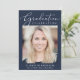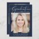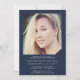 Elegant girl's dark blue graduation announcement and grad party invitation featuring "Graduation Celebration" in modern white script and typography, her photo and her name, school and class year in simple white typography. On the back, add another photo and the graduation party details.