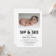 Minimalist sip and see party invitation featuring a white background, a photo and a modern invitation template that is easy to personalise. All font styles and sizes are easily changed by clicking on the cutomize further link after personalising.