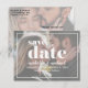 This design features a modern simple photo picture minimal, with a vellum photo transparent overlay, and a budget-friendly postcard template. a minimalist engaged engagement couple, a creative stylish trendy typography, a white bold text font overlay, a clean simplistic simple trendy, sleek contemporary modern style, a classic traditional whimsical fun, a vertical classic landscape photo, a modern typography design, a one photo collage template