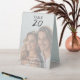 Celebrate your special day with this beautifully refined photo wedding table number, featuring a romantic portrait of a Caucasian couple as the centerpiece of the design. The top and bottom third of the layout showcases elegant black calligraphy text enhanced with a soft white drop shadow, ensuring high contrast and beautiful readability against the photograph.