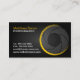 © 2012 Socialite Designs. Modern photographer business card with yellow shutter design and gold text. The shutter design element can be moved and resized on the business card. Choose a different background colour and font style to suit your business.