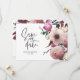 Modern photographic floral wedding save the date. In purples, pinks, browns and green. Modern take on rustic wedding with script handwriting.