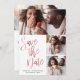 Modern wedding save the date announcement card featuring a collage of your favourite photos (3 on the front, 1 on the back), "Save the Date" written in a stylish rose gold faux foil script and your names, wedding date, venue and website in simple, minimal typography.