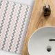 This bath mat features a modern chevron pattern in brush pink and grey.
