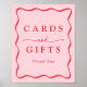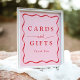 Add a stylish touch to your wedding, bridal shower, baby shower, graduation party, or other special event with this Modern Pink and Red Wavy Frame cards and gifts sign. The design features "Cards and Gifts" in bold red lettering surrounded by a red wavy border contrasting with a light pink background. Personalise the retro cards and gifts sign with your custom text below. Choose between professional printing or instant download options, providing flexibility for your convenience.