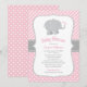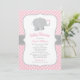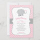 This sweet baby shower invitation features an adorable grey baby elephant with heart splashes set inside an elegant bracket frame, surrounded by a soft pink diagonal stripe border and coordinating pink polka dot backing. The charming, feminine design is perfect for a baby girl celebration. All wording is fully customisable for your event.