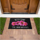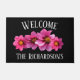 Lovely modern floral design features a black background. Across the centre of the doormat is a row of beautiful pink flowers. These bright hot pink flowers really pop on this dark, black background making it a modern design choice to add to your home's decor. There is text in white font in an arch form that says Welcome as well as text to personalised with your name, family, name, etc. Greet your visitor in style with this lovely floral doormat.