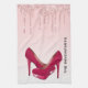 A modern, trendy design on a kitchen towel. The background has an image of sparkling pink glitter drips, along the top. The rest of the background is a delicate pastel pink colour gradient. A pair of high heel pink stilettos add a stylish fashionable vibe.