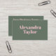 This modern business card features a muted forest green background with elegant blush pink typography for a refined, professional look. The clean layout includes space for name, business information, and contact details, making it ideal for creative professionals, small business owners, or boutique brands. A perfect blend of simplicity and sophistication for standout branding.