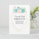 A wedding save the date flat card with a pretty pastel watercolor succulents bouquet. These succulent flowers, leaves and sprigs are a soft pink and green. A trendy geometric frame with a faux gold foil border.