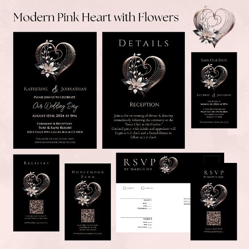 Modern Pink Heart with Flowers Wedding CollectionDesigned by Art Colory