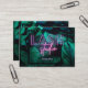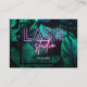 Add your name and contact info to this modern lash studio/eyelash extension business card, featuring tropical dark green foliage and a midnight blue frame. The words "Lash" and "studio" are in purple and pink neon typography with your name underneath it, and your contact details on the back of the card. Contact the designer if you would like a different colour on the neon texts.