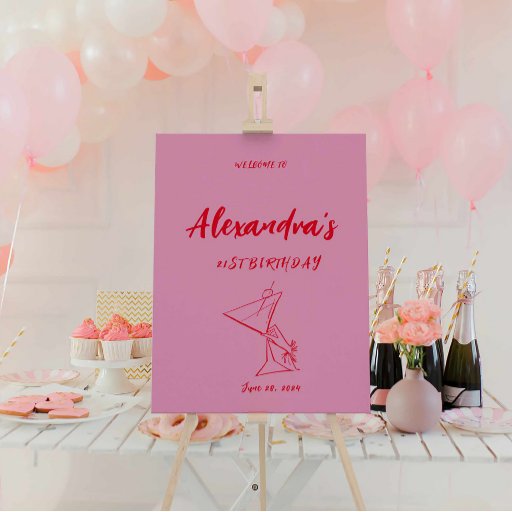 A hand-drawn pink and red modern 21st birthday invitation features my unique hand-drawn cocktail illustration with playful script font for your stylish twenty first birthday celebration. With this design, you can personalise with your details on both the front and back card design.