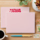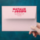 A retro modern hand written bright colourful wedding envelope. Which features bold bride and groom's names in red magenta colour. And personalised return address . On simple blush pale vintage colour background. Which suits the whole wedding suite.