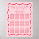 Direct your guests with style using this Modern Pink and Red Wavy Frame Wedding Seating Chart Poster. A pink background with a bold red wavy border frames 12 tables, each with guest names listed beneath. The phrase “Find Your Seat” is highlighted at the top in handwritten red script, while your names and wedding date complete the layout. Available as a professional print or instant download.