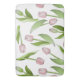 The product design features a pattern of pink tulip flowers. This botanical illustration makes a modern chic and unique bath mat.