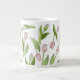 The product design features a pattern of pink tulip flowers. This botanical illustration makes an elegant modern and unique large coffee mug - Gift idea for her birthday, Easter, Mother’s Day, wedding, and more!