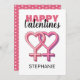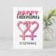 Surprize your girlfriend, wife, partner or secret crush with this cute, simplistic, pink valentines card. This LGBT card features the text 'HAPPY VALENTINES' 2 heart women symbols interlocking and the name of the person, the back of the card has a background of pink with white polka dots. The font styles, size and colour can be changed by clicking on the customise further link after personalising.