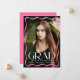 Celebrate your high school or college graduate with this elegant graduation announcement, featuring a full-bleed vertical photo framed by a stylish pink wavy border. "Grad" is displayed in bold white lettering making a statement, while the graduate’s name, school, and class year add a personal touch. The back includes a horizontal photo with space for a custom message, making it the perfect way to share this special milestone with family and friends.