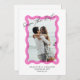 This modern wedding thank you card features a wavy transparent frame in bold pink surrounding your photo, paired with elegant script typography. The unique frame design adds a fun and contemporary twist while keeping the layout clean and stylish. On the back, it includes a pre-written thank you note that you can keep as is or replace with your own words. Personalised with names and wedding date, it’s the perfect way to share gratitude with loved ones in a memorable design.